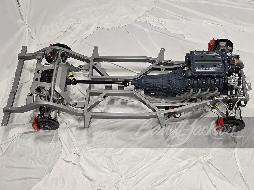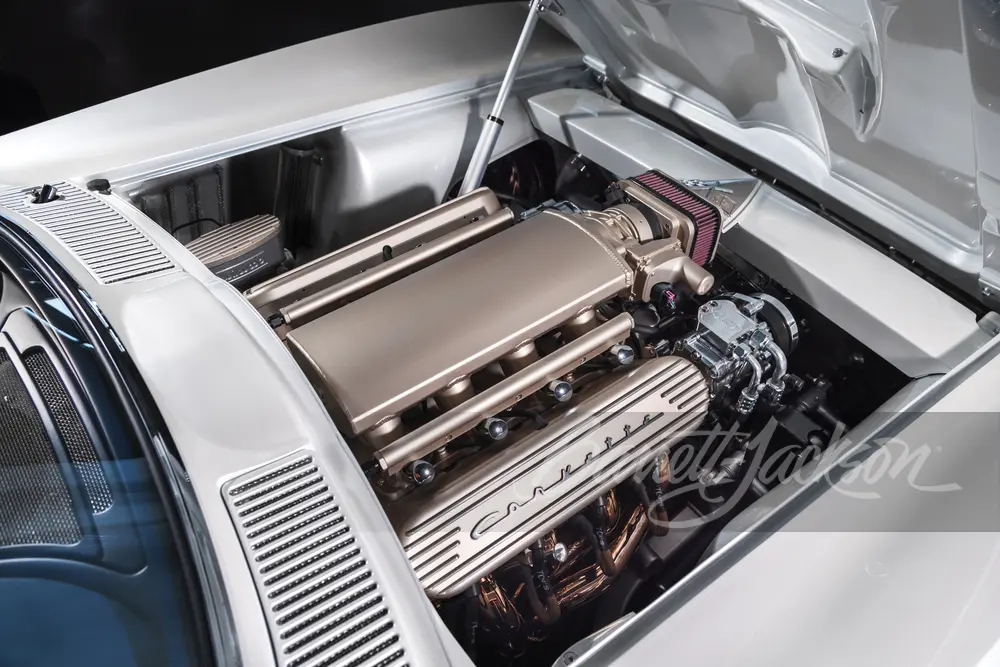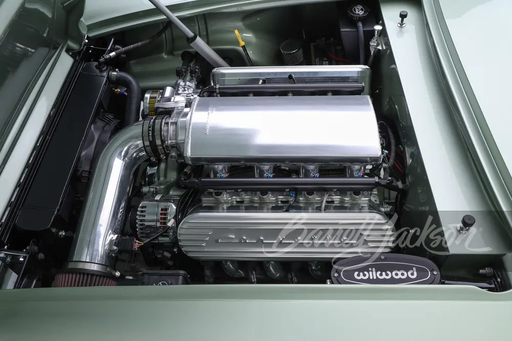 Timeless underwent a full body-off rotisserie restoration by Why Not Motors, blending iconic design with contemporary execution. Power comes from a GM E-Rod crate package featuring a supercharged LT4 6.2-liter V8 rated at 650 horsepower, paired with a new 10L90E 10-speed automatic transmission, all managed by factory GM wiring and computers. The car rides on a fully independent Art Morrison chassis with adjustable ride height via Strange coilovers, with stopping handled by Wilwood 14-inch rotors and six-piston calipers.