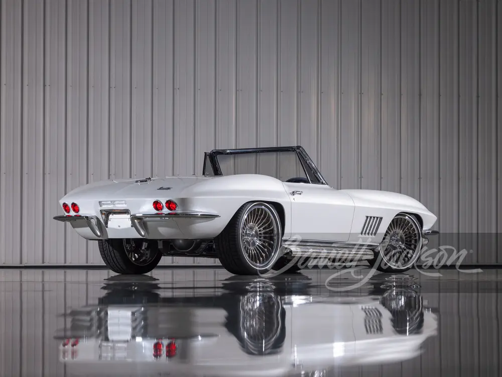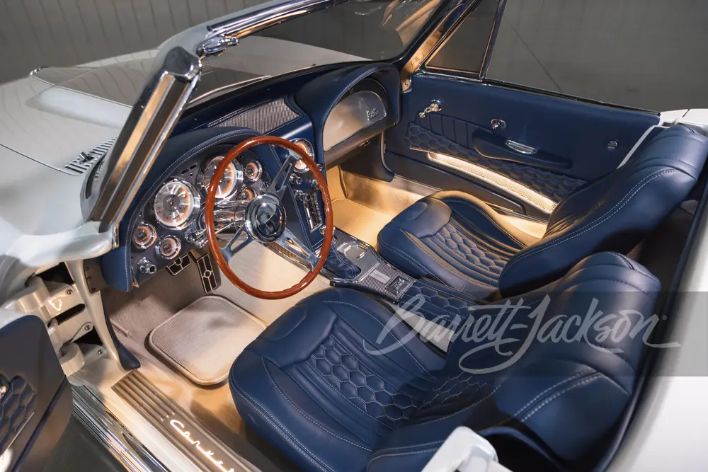 At its core, this Corvette blends classic identity with contemporary performance and comfort. Power comes from an LS3 Hot Cam engine rated at 540 horsepower, matched to a 4L70E automatic overdrive transmission and anchored by an Art Morrison sport chassis. The car is equipped with polished Wilwood four-wheel disc brakes, power steering, power windows, and a power hood. Finished in Ferrari Bianco Fuji Pearl White with an Oyster convertible top, it pairs an Indigo Blue interior with a teak steering wheel, chrome Ididit steering column, and an AM/FM Bluetooth stereo feeding Polk Audio speakers. Schott wheels with white line tires complete the stance, and even a Ferrari-style battery tender was included for good measure.