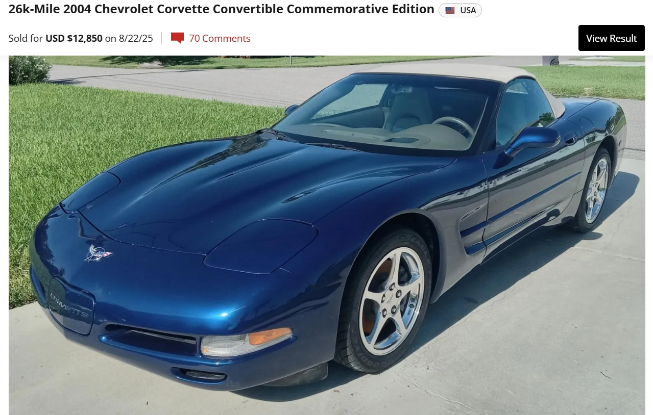 “This 2004 Chevrolet Corvette convertible is one of 2,659 “24 Hours of Le Mans” Commemorative Edition convertibles produced from the 2004 model year, and it was purchased in 2024 by the seller as a gift to their wife for their 44th wedding anniversary. Indicating 26k miles, the car has spent a total of 20 years registered in Florida, and it is powered by a 5.7-liter LS1 V8 paired with a four-speed automatic gearbox. Finished in Le Mans Blue Metallic over Shale leather, equipment includes a limited-slip differential, a Shale convertible soft top, 17″ and 18″ polished five-spoke wheels, continuously variable adaptive dampers, power-adjustable seats, dual-zone automatic climate control, and a Bose sound system. This C5 convertible is now offered with a 2025 Florida DMV inspection report, recent parts invoices, and a Florida title in the seller’s name.”