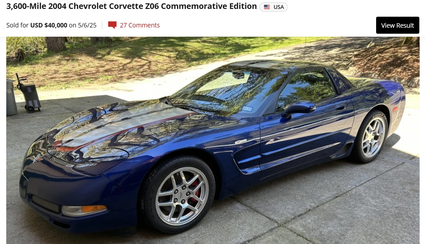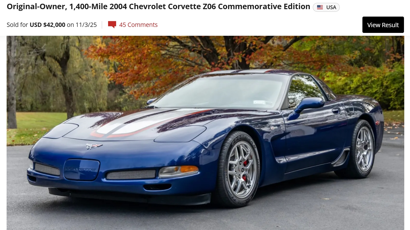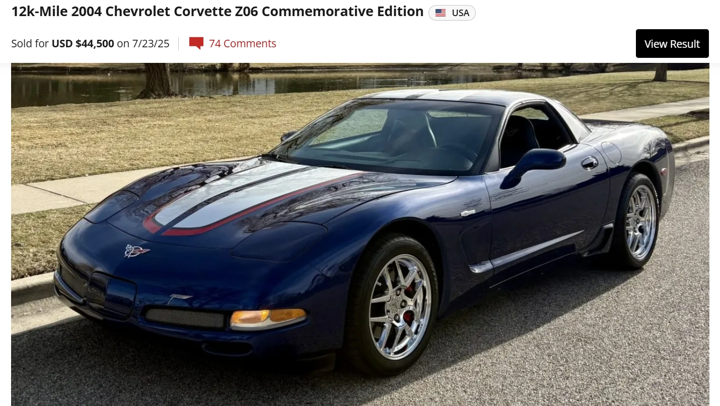 “This 2004 Chevrolet Corvette Z06 is one of 2,025 Commemorative Edition models produced to celebrate the C5-R’s class victories at the 24 Hours of Le Mans, and it has 12k miles. The car is powered by a 5.7-liter LS6 V8 linked to a six-speed manual gearbox and a limited-slip differential, and it is finished in Le Mans Blue over black leather. Equipment includes Commemorative Edition-specific polished lightweight wheels, a carbon-fiber hood, racing stripes, and a titanium exhaust system as well as pop-up headlights, a Hurst shifter, a Kenwood touchscreen head unit, dual-zone climate control, a head-up display, a power-adjustable driver’s seat, and a Bose sound system. Purchased by the seller in 2025, this C5 Z06 is now offered with a window sticker, manufacturer’s literature, a 2024 service record, a model car, a clean Carfax report, and a clean Idaho title in the seller’s name.”