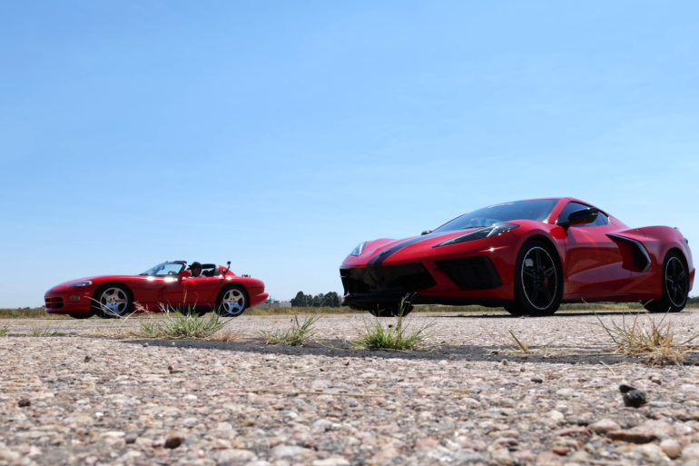 Although the mid-engine Corvette (left) is definitely a significant departure from its predecessors, there is no denying its Corvette heritage or its relationship to earlier models, such as the C7 to its right.