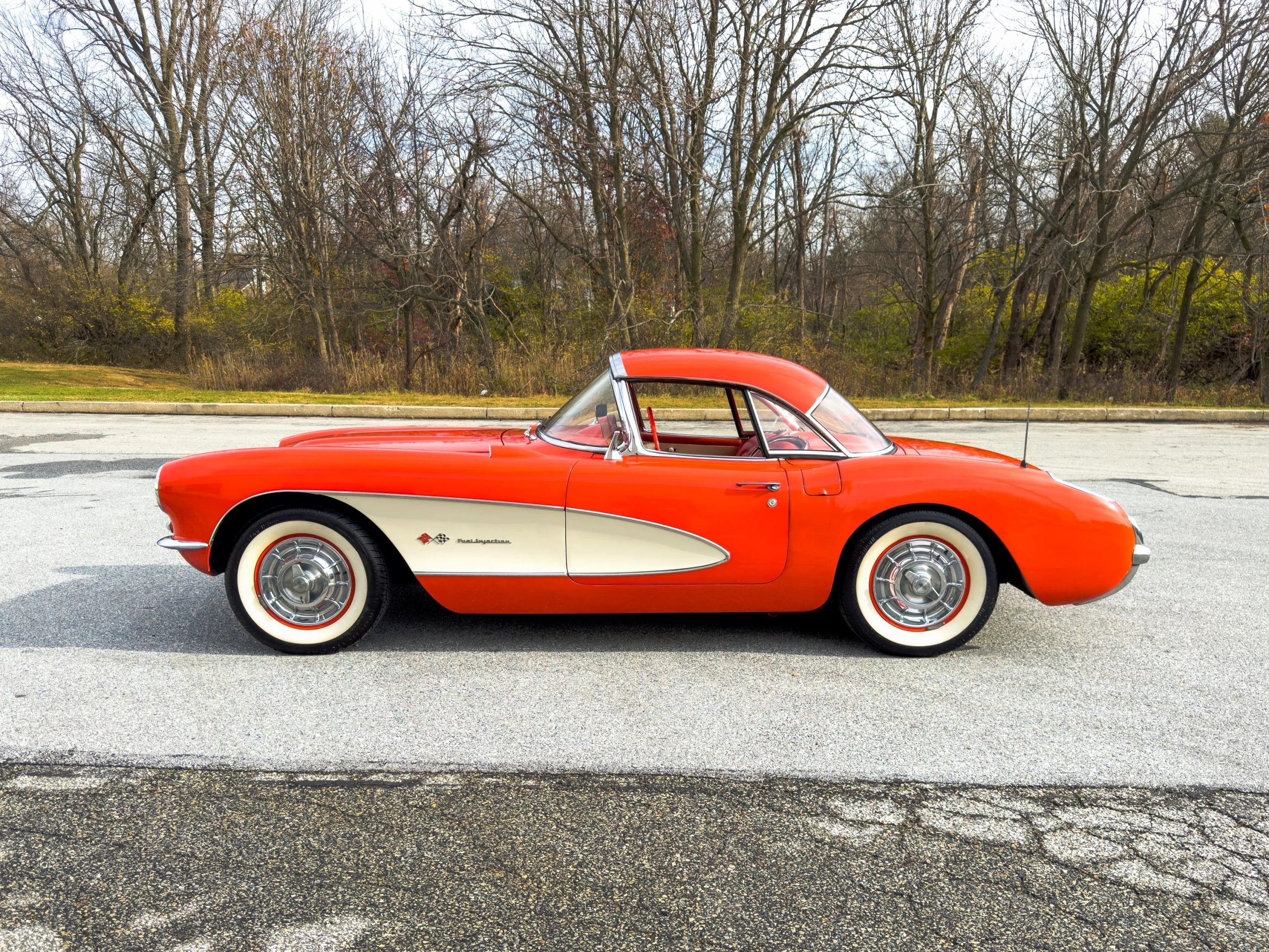 Finished in Venetian Red with Polo White coves over a red interior, this example is one of only 182 examples produced for the model year equipped with the Rochester fuel-injected 283-cubic-inch V-8 rated at 250 horsepower. The 1957 model year is widely regarded as the high point of the first-generation Corvette, retaining the clean, elegant design introduced in 1956, including exposed headlights without stone guards, recessed taillights, and the signature 13-tooth chrome grille.