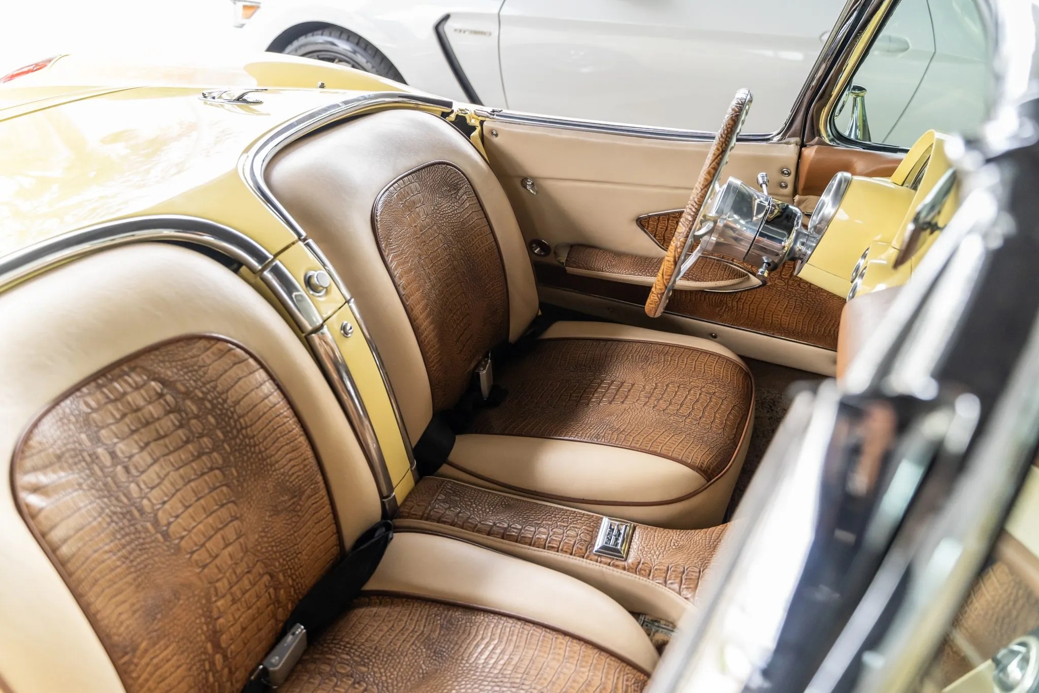 Inside, the cabin blends retro flair with modern touches. An aftermarket steering wheel features a brown reptile-pattern wrap, paired with AutoMeter Carbon Fiber Ultra-Lite auxiliary gauges. Two bucket seats are upholstered in tan with matching reptile-pattern inserts, echoed across the center console and door panels.