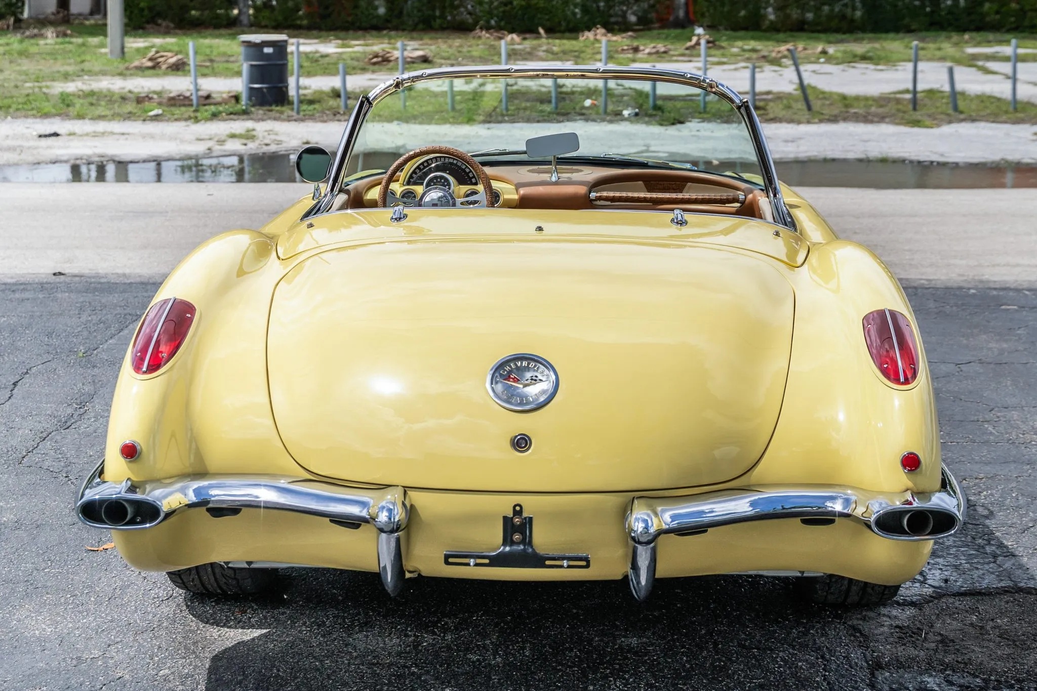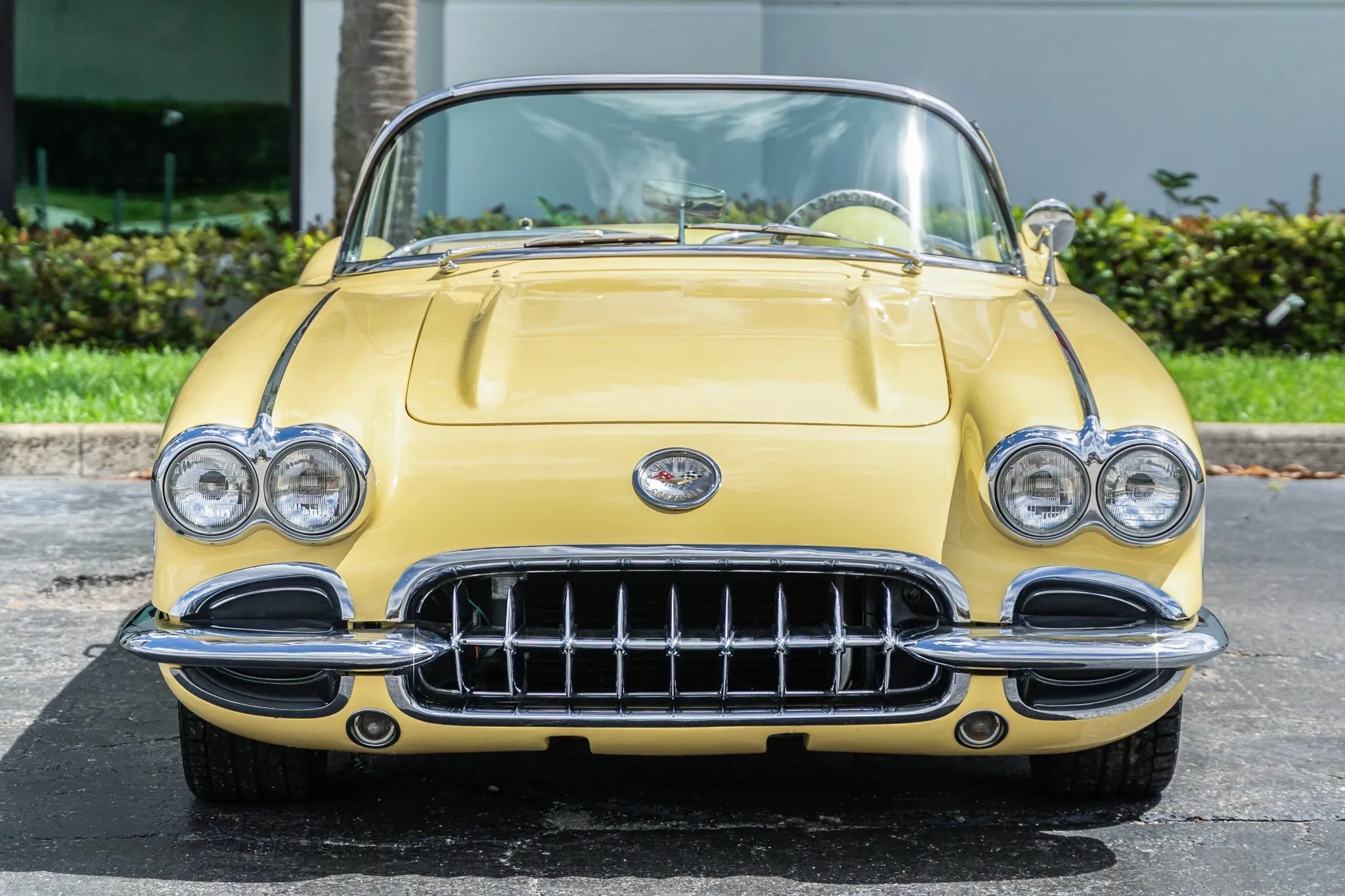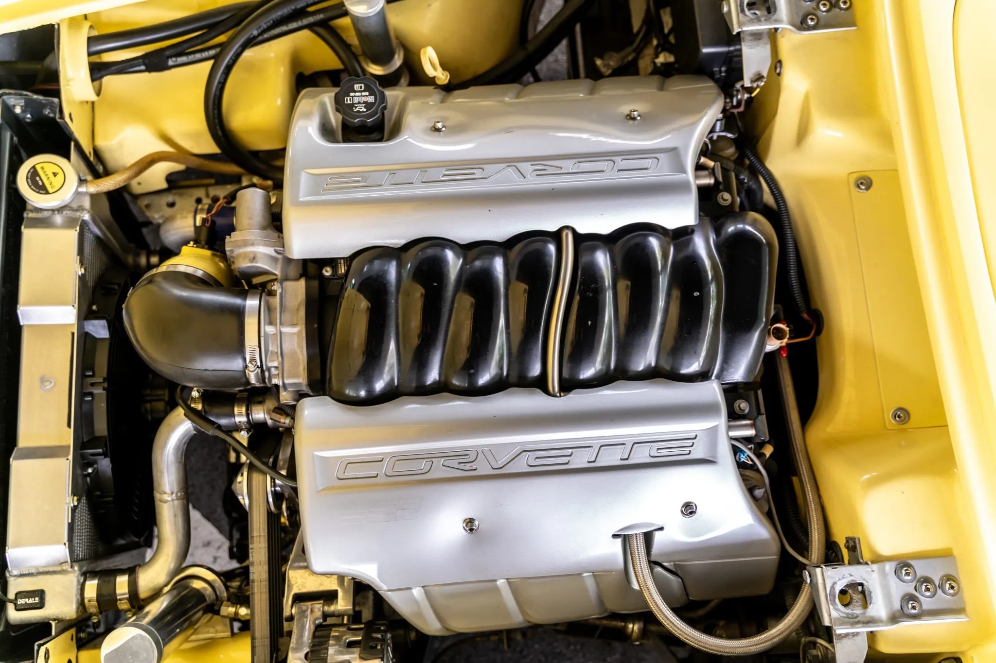 Power comes from a 6.2-liter LS3 V8, driving the rear wheels through a five-speed manual transmission. The body is finished in yellow with contrasting white coves, complemented by a white convertible soft top. Period-inspired details include quad headlights, split chrome bumpers, fender vents, and dual exhaust outlets, preserving the unmistakable C1 aesthetic.