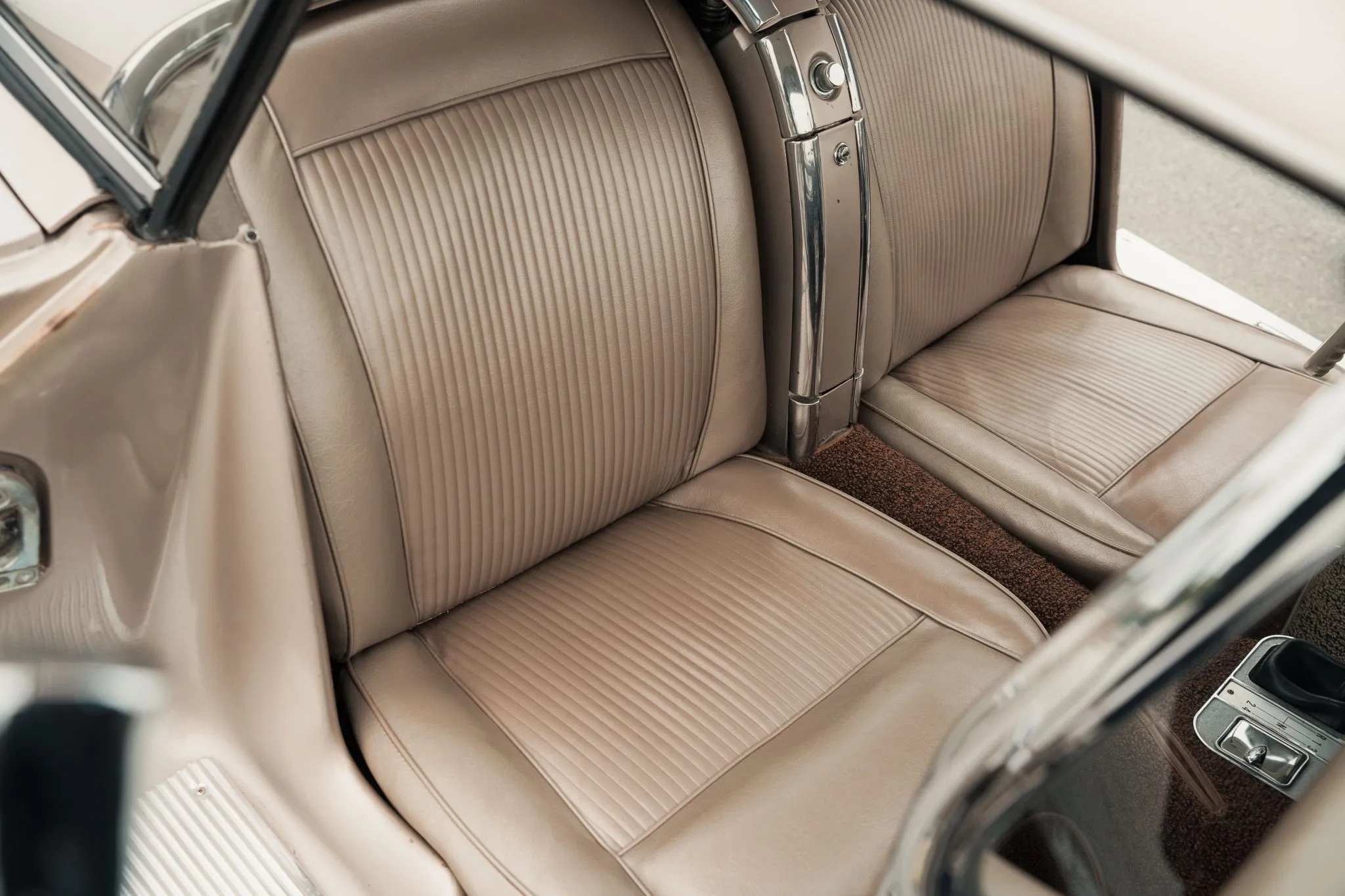 Inside, the cabin mirrors the exterior’s level of care, with beige vinyl bucket seats, a matching dashboard, door panels, and carpeting. Amenities include a dash-mounted rearview mirror, reverse lockout shifter, bright interior trim, heater and defroster, an analog clock, a centrally mounted tachometer beneath the sweeping half-circle speedometer, and a Wonder Bar push-button radio.