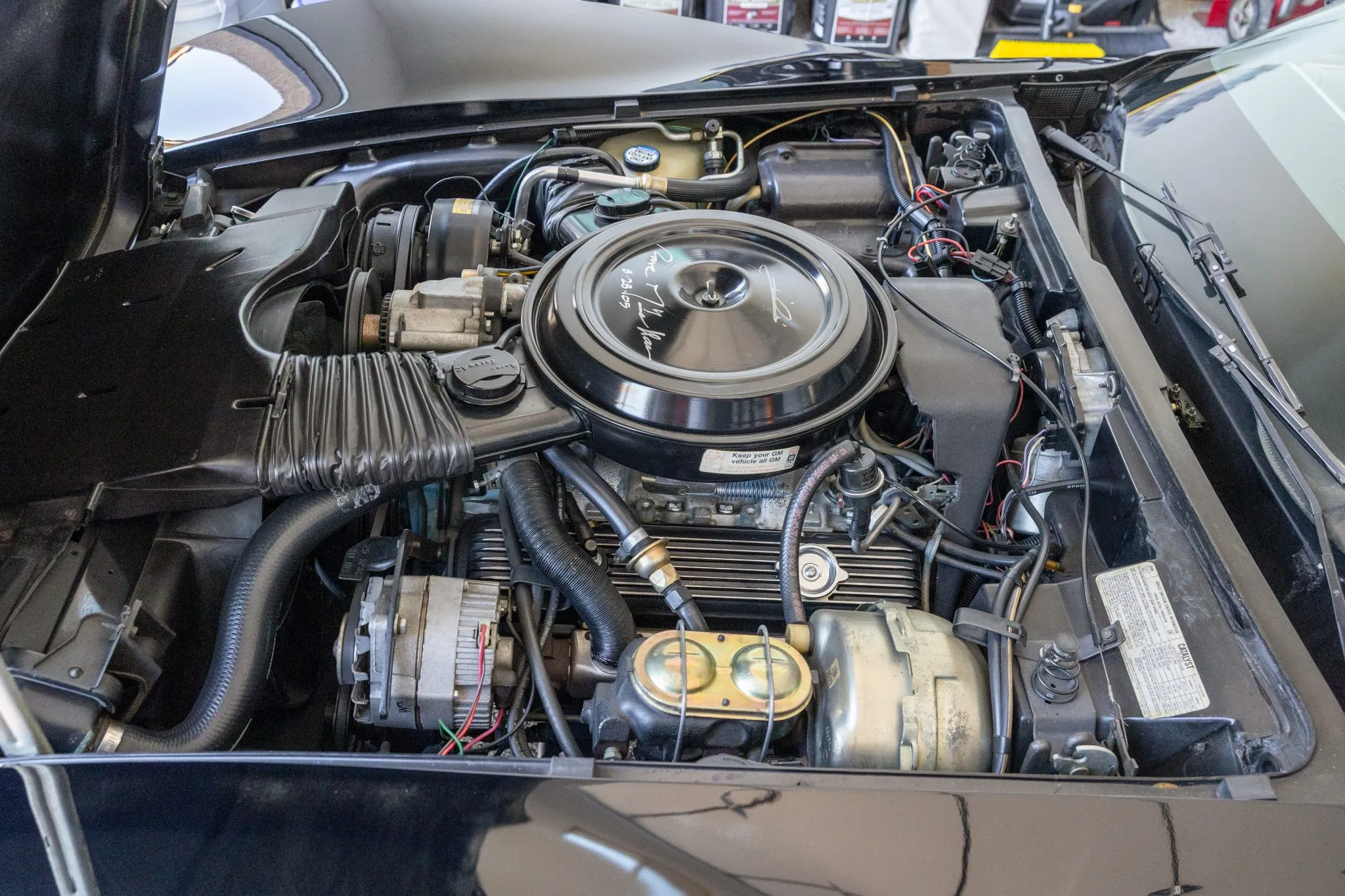 Finished in its signature black-over-silver livery with silver leather upholstery, it’s powered by a 350ci L82 V8 rated at 220 horsepower and 260 lb-ft of torque, paired with a four-speed manual transmission and a Positraction differential.