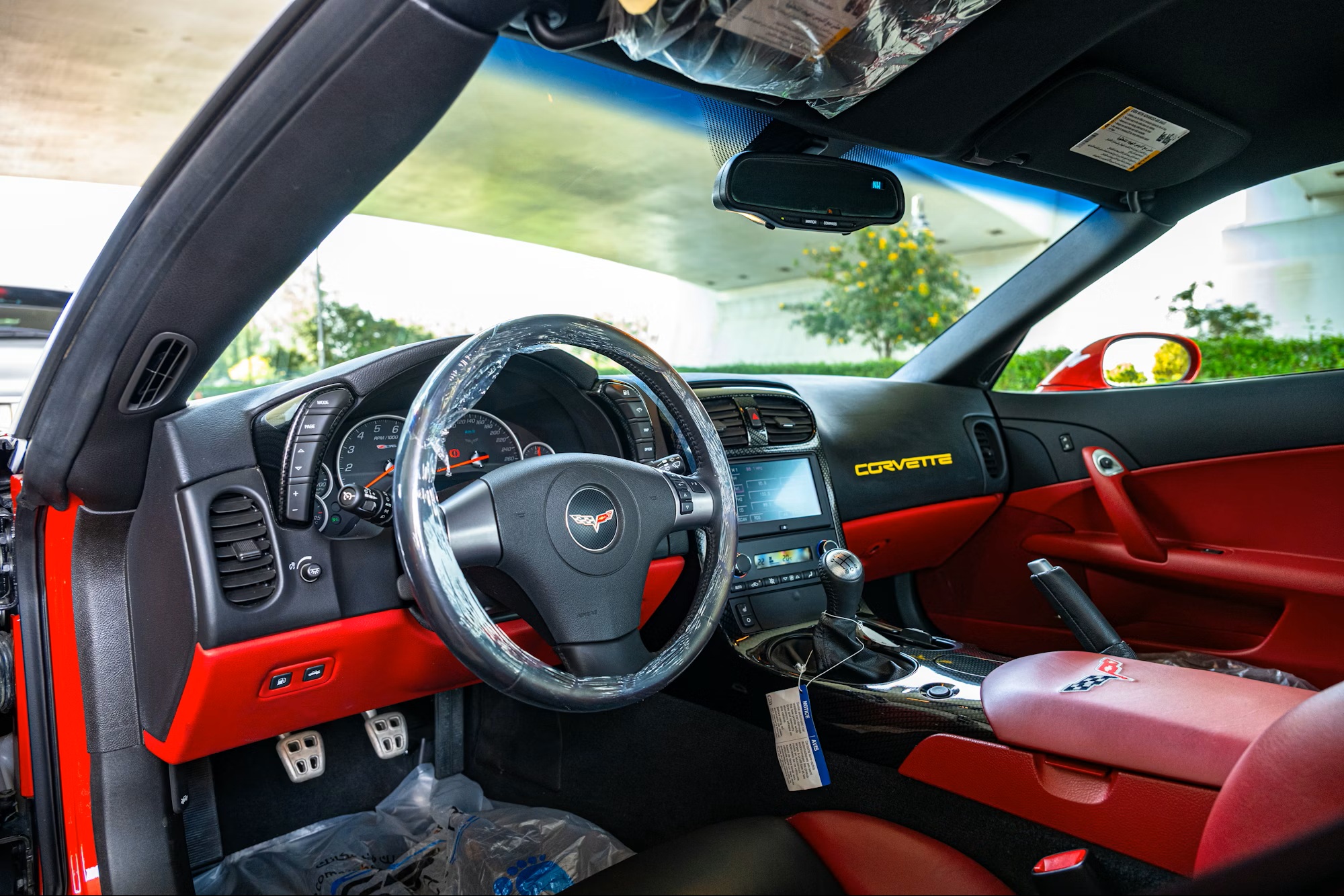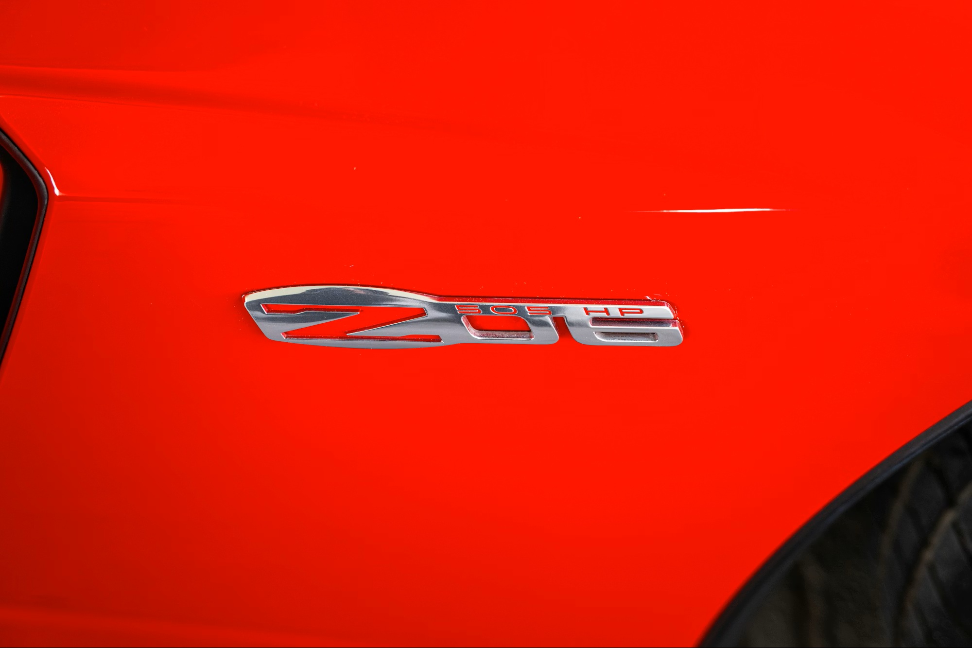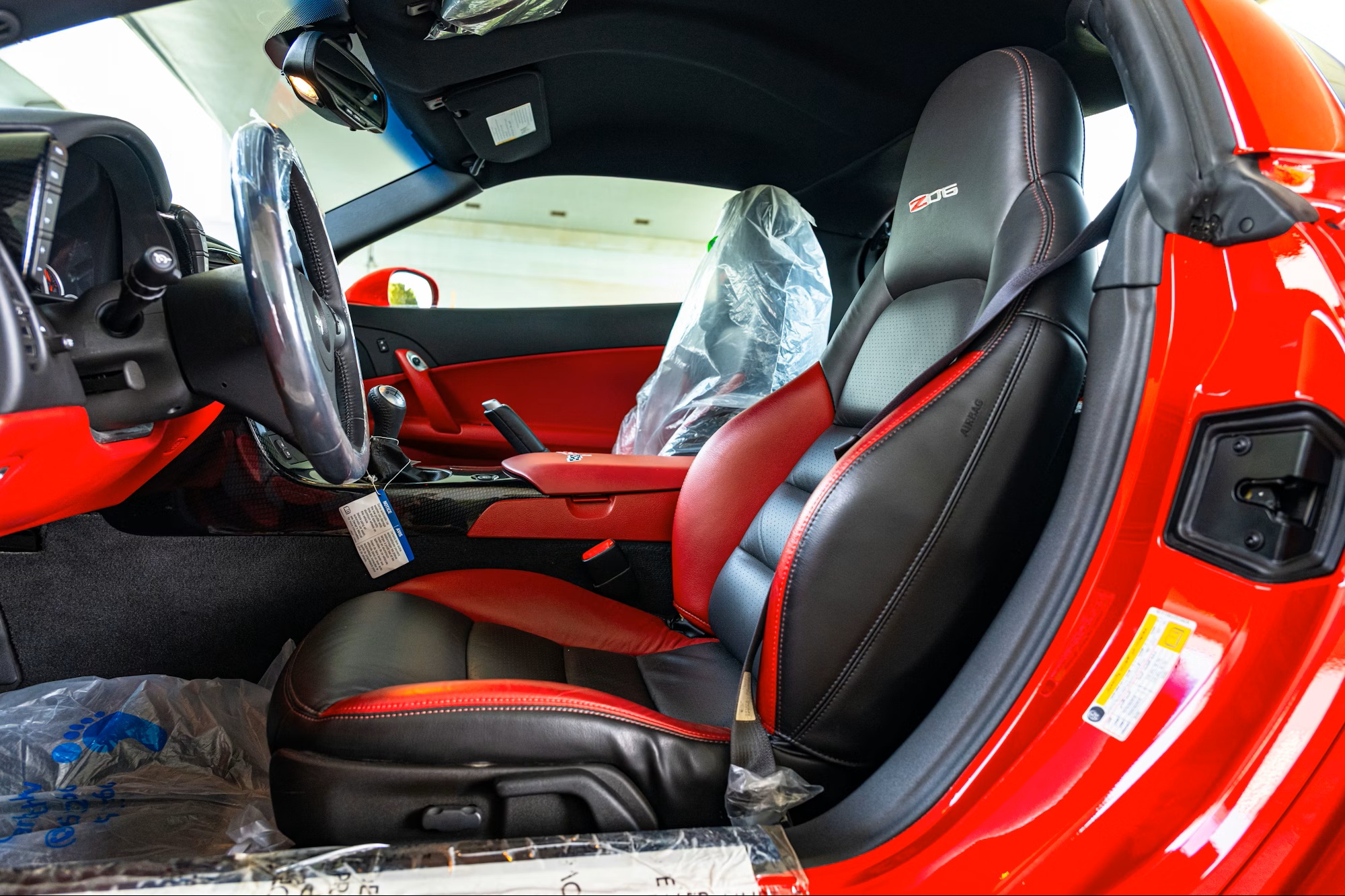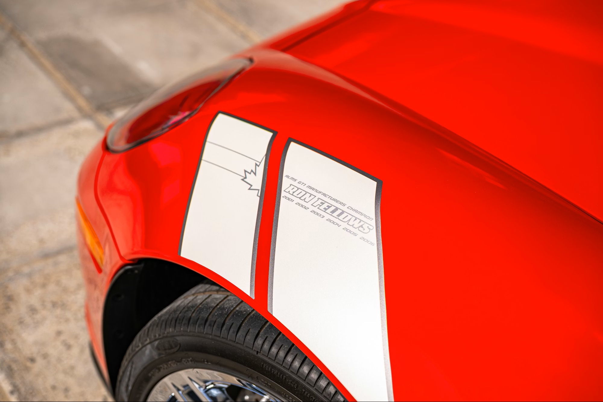 Exclusive features include a full-width rear spoiler, a windshield banner, the 2LZ equipment package, chrome alloy wheels, racing-inspired graphics, and Ron Fellows’ signature on the center armrest. The exterior is finished in bright red with contrasting white fender stripes, complemented by a black and red leather interior with embroidered “Z06” logos on the headrests, a Corvette emblem on the armrest, and carbon-fiber trim accents.