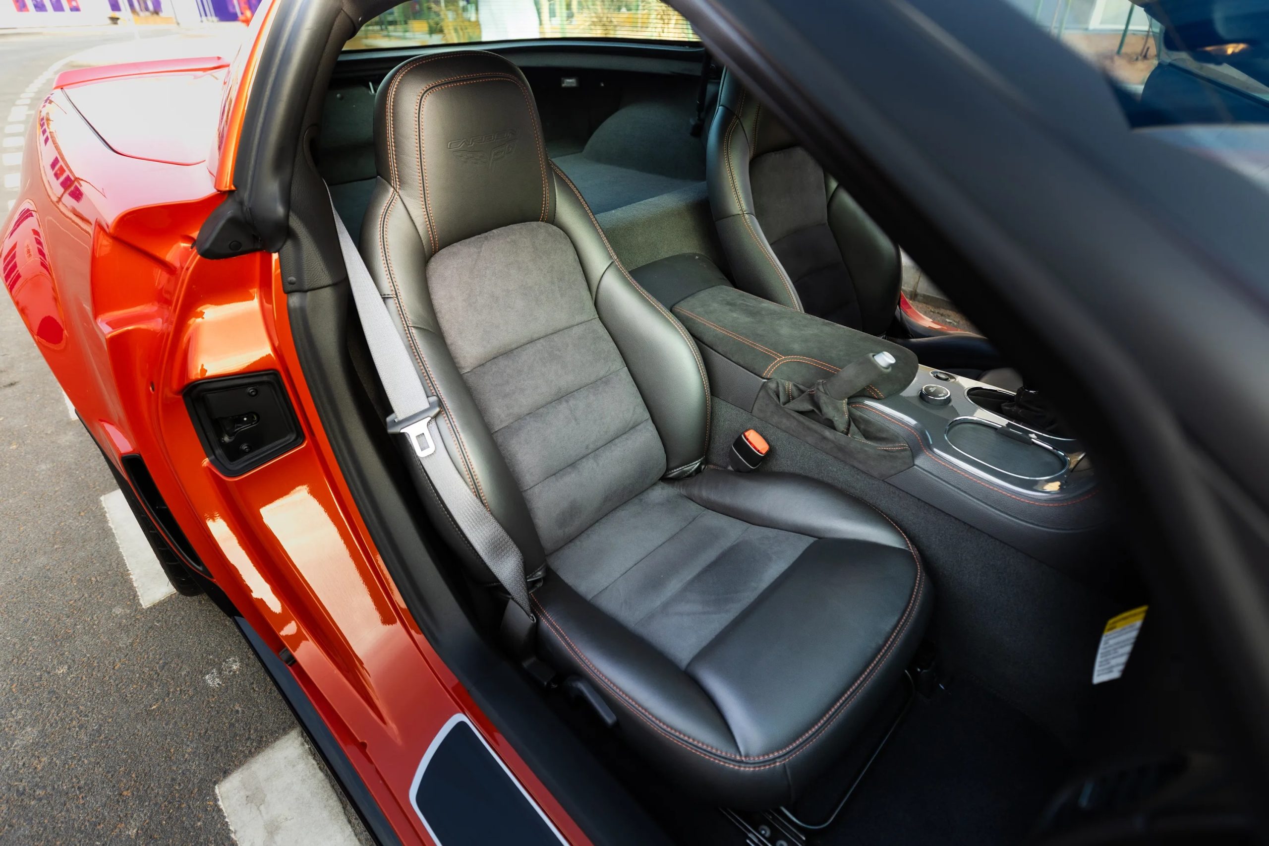 The Ebony and suede interior features orange contrast stitching, a unique Z06 Carbon steering-wheel badge, special sill plates, and embossed headrests. Equipment includes dual-zone climate control, power accessories, cruise control, a six-speed manual gearbox, engine and transmission coolers, Brembo carbon-ceramic brakes, magnetorheological suspension, and 20-spoke black aluminum wheels.