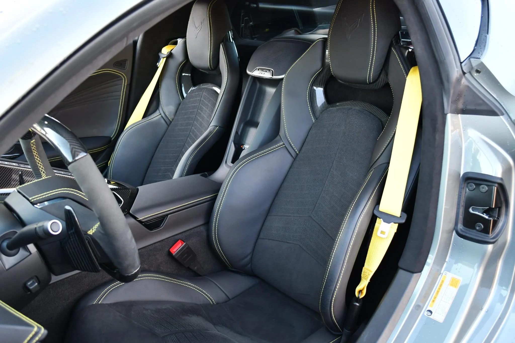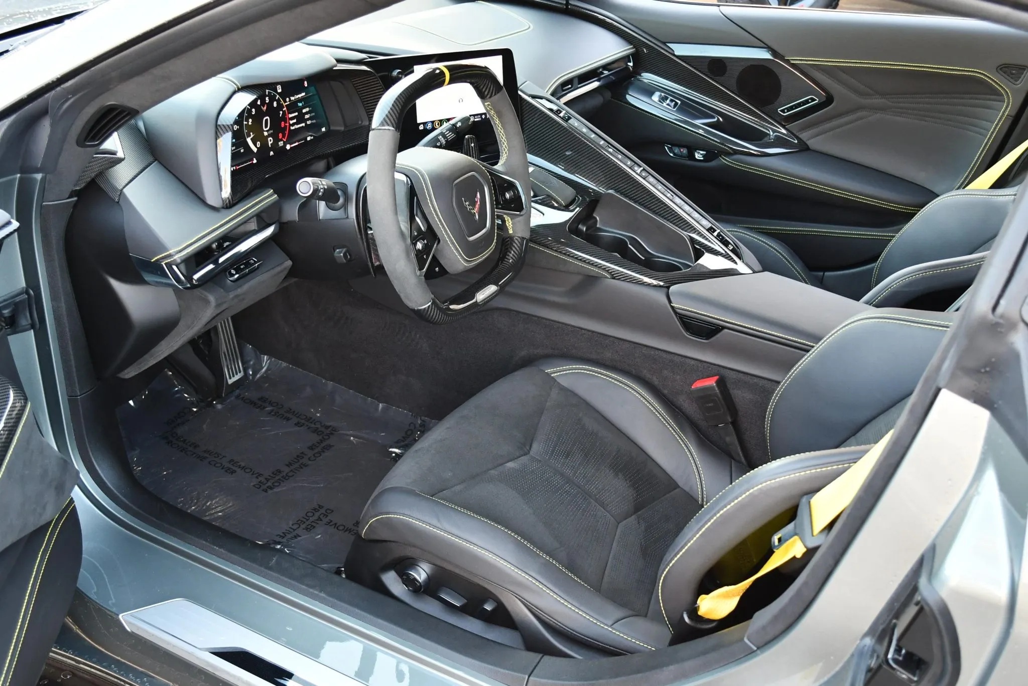Inside, the Z06 balances track dominance with grand-touring comfort. The cabin features Carbon Fiber Interior Trim Level 2 and the Stealth Interior package, accented by yellow stitching and seatbelts. Heated and ventilated GT2 bucket seats are trimmed in Jet Black leather with suede inserts, while a carbon-fiber and suede steering wheel carries a yellow center stripe.
