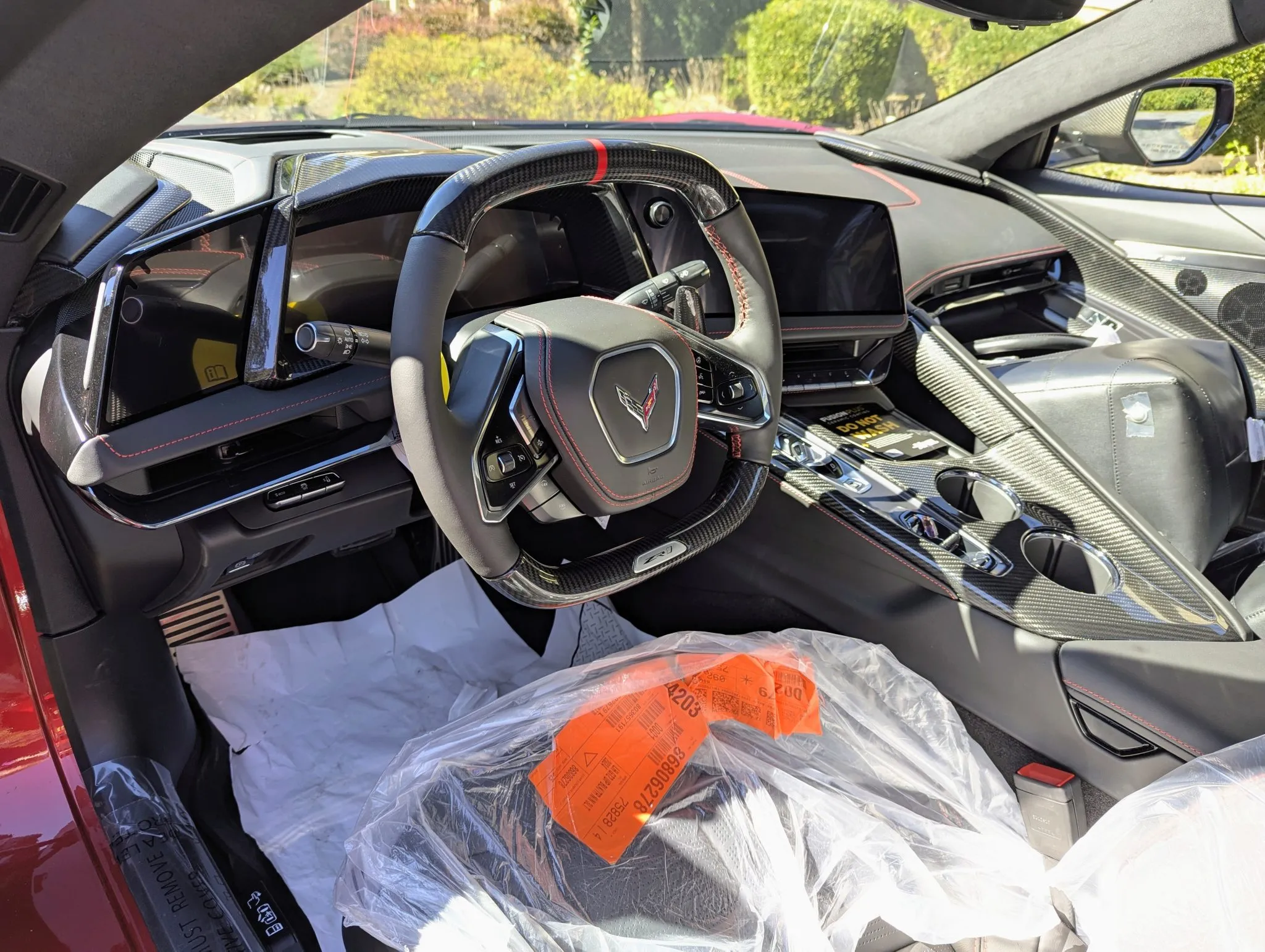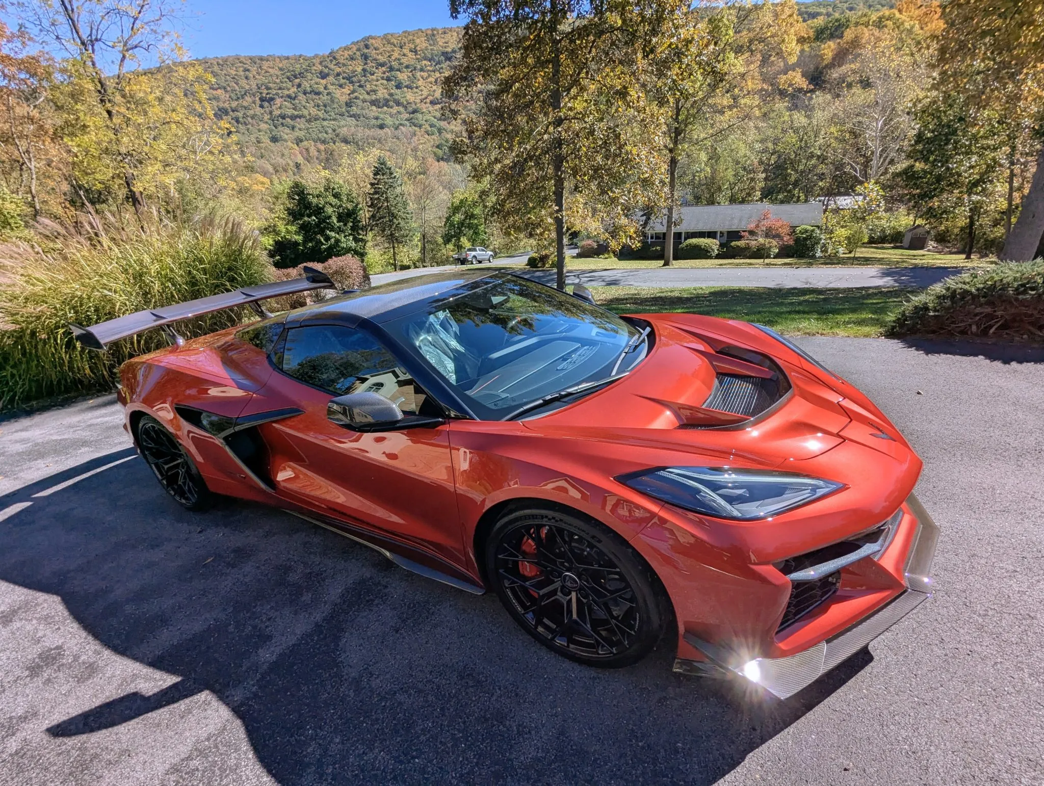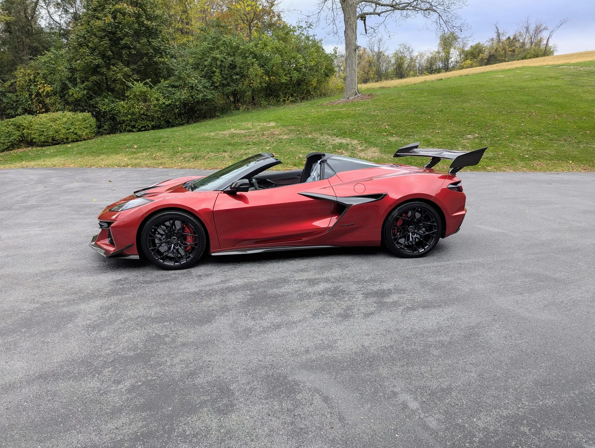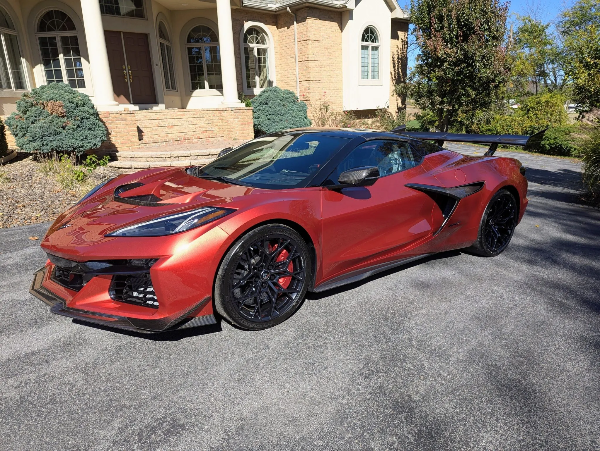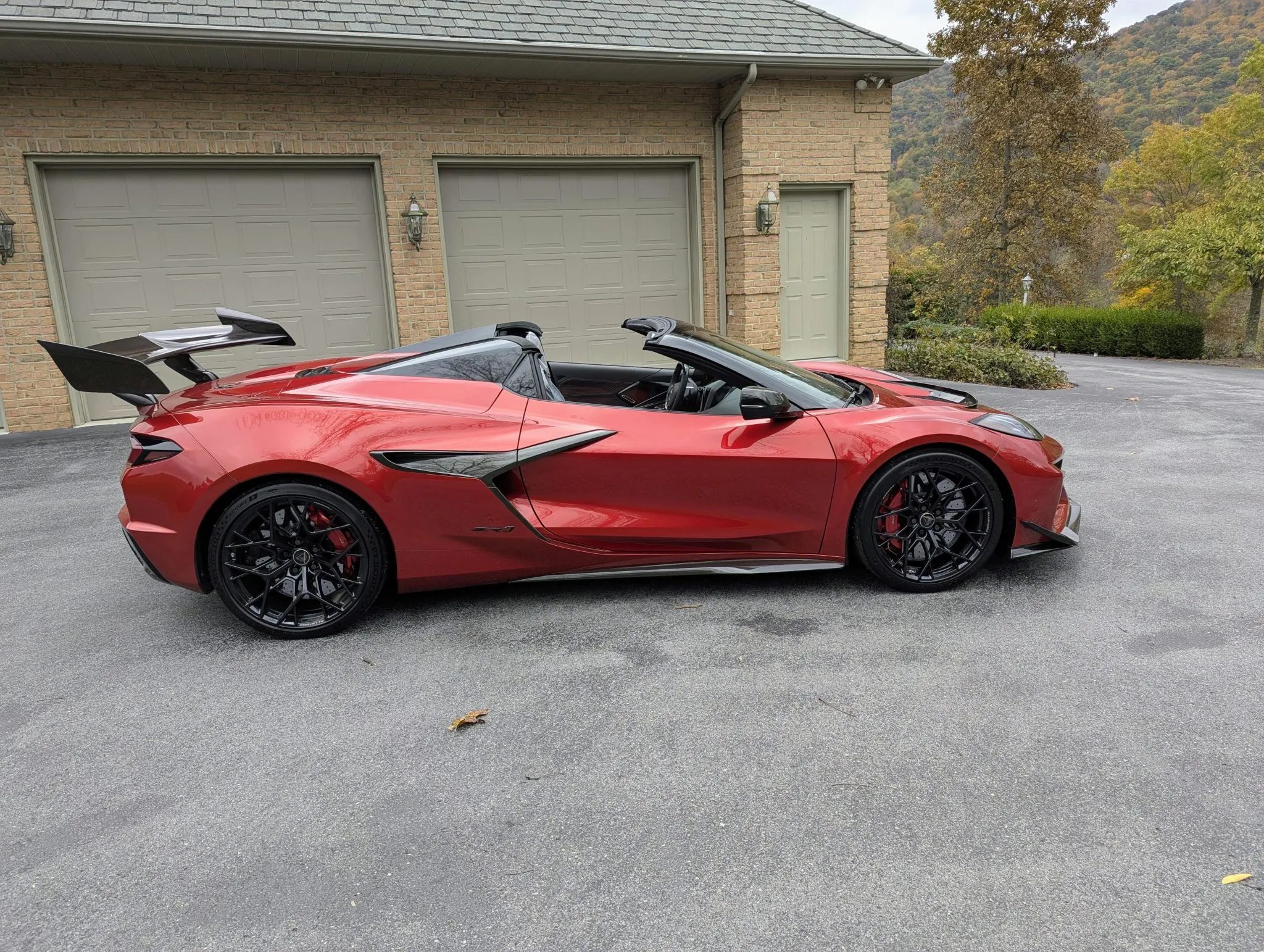 Introduced in July 2024, the C8 ZR1 is the most powerful Corvette ever built and the first production model to feature a twin-turbocharged engine. This particular example, listed on Bring a Trailer with just 18 miles, is finished in Red Mist Metallic Tintcoat and equipped with a power-retractable hardtop and enlarged rear fender scoops.