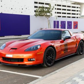The fiberglass body is white and has fender vents, chrome bumperettes, flip-up headlamps, a left mirror, a rear-mounted antenna, and a side-outlet exhaust with heat shielding. The staggered American Racing Wheels have Michelin Pilot Sport Cup 2 tires measuring 235/40ZR18 up front and 345/30ZR20 out back.