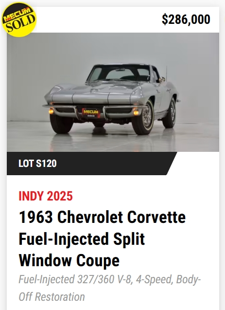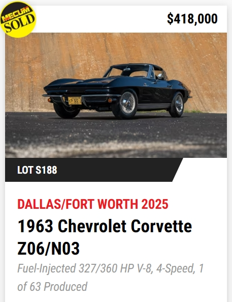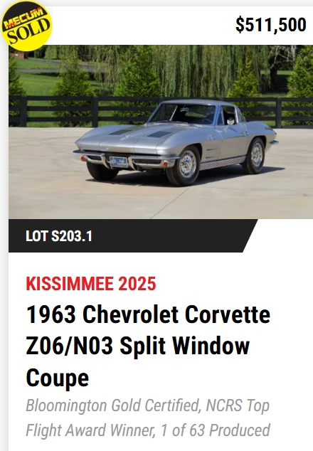 If there was a defining trend in 2025, it was the dominance of Z06/N03 “Tanker” coupes at the top of the market. Three of the four highest sales carried the ultra-rare Z06 Special Performance Package paired with the massive N03 fuel tank, with hammer prices cresting past the half-million-dollar mark. These cars weren’t just expensive—they were exceptional, combining fuel-injected power, heavy-duty brakes and suspension, and documented production rarity that borders on mythical. Awards like NCRS Top Flight, Bloomington Gold Certification, Duntov Marks of Excellence, and CCAS/Grenning affirmations weren’t just footnotes; they were value multipliers, reinforcing that the most money follows the most correct cars.