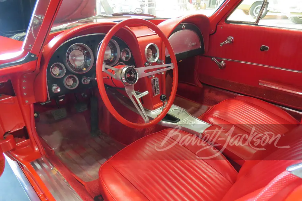 “This 1963 Chevrolet Corvette 327/360 Split-Window “Fuelie” coupe previously received a meticulous body-off restoration and is powered by its matching-numbers 327/360hp fuel-injected engine linked to a T10 4-speed manual transmission. This detailed and correct car has been refinished in its correct factory 923-code Riverside Red color, along with a matching red interior that features an AM radio.”