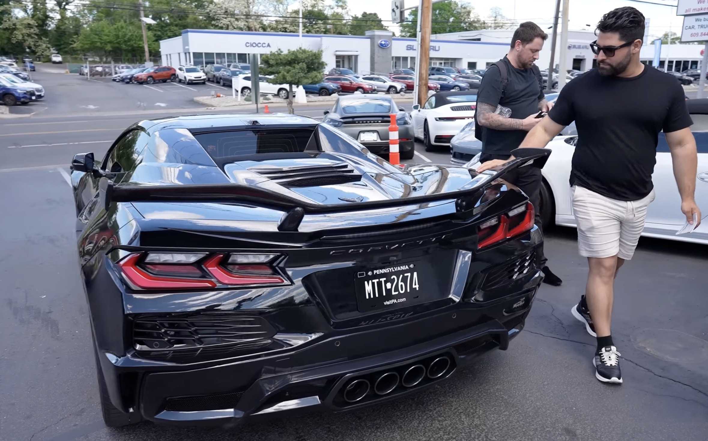 Rear view of a black C8 Z06 Corvette with Pennsylvania license plates