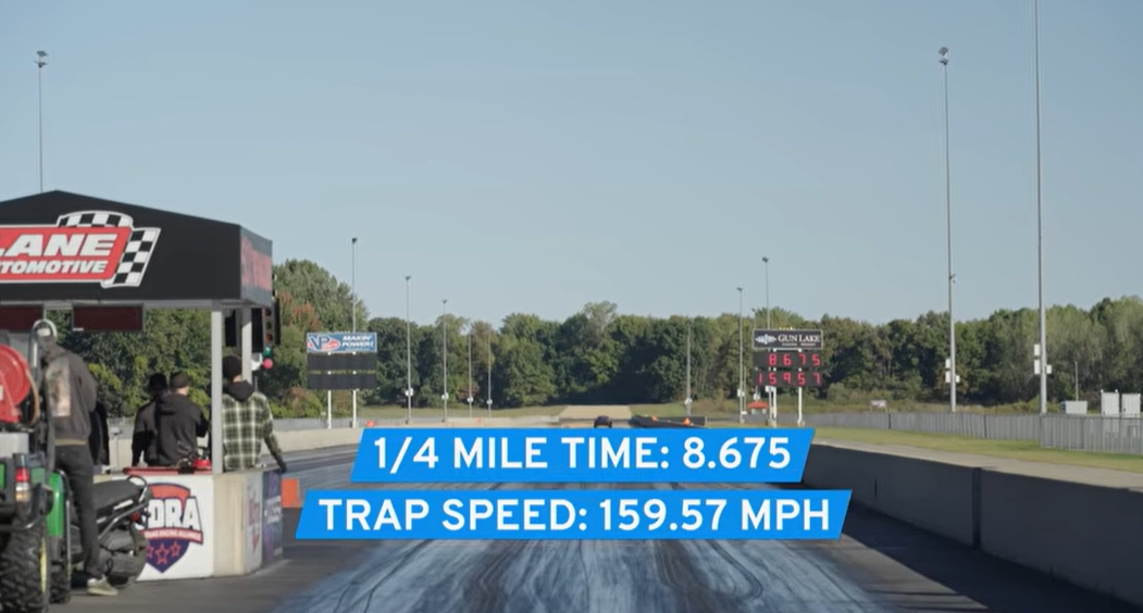 - Performance benchmarks: 8.675-sec 1/4 mile @ 159.57 mph, 1.680-second 0–60, ~1.5 g acceleration through first and second gear