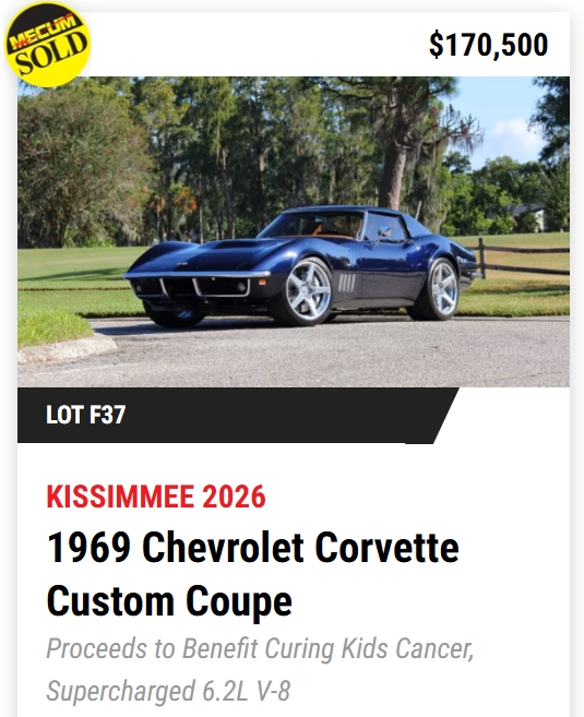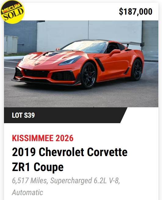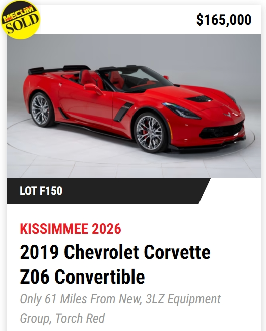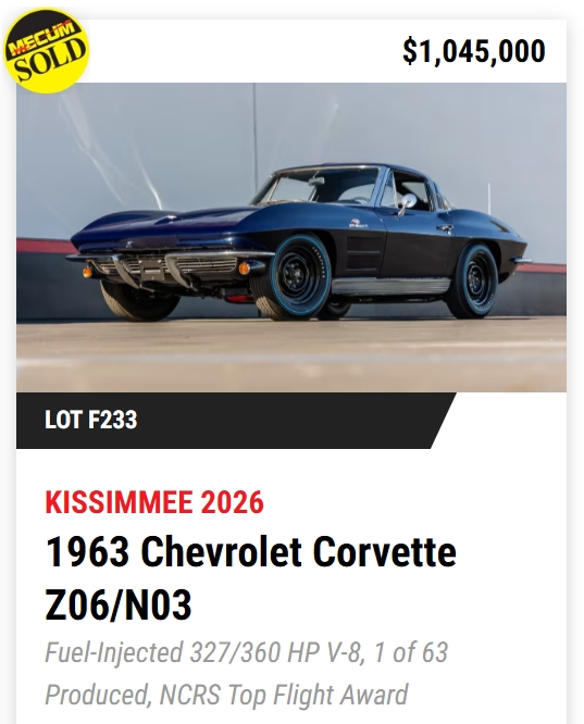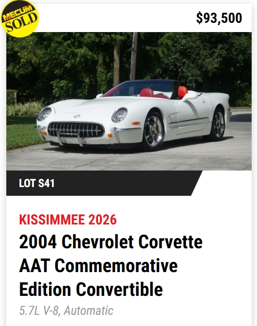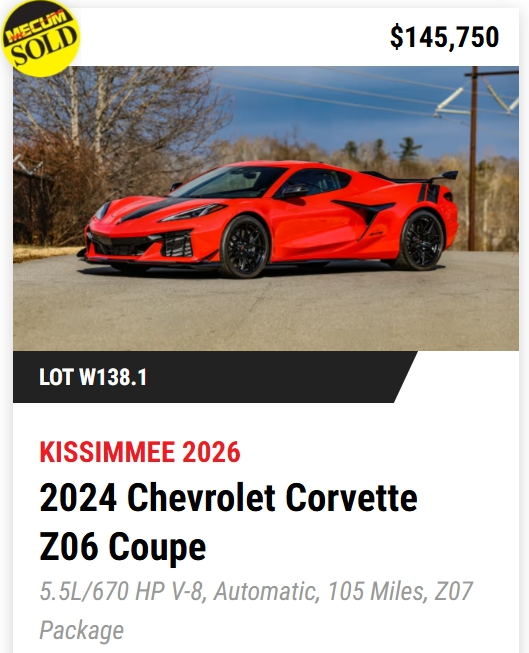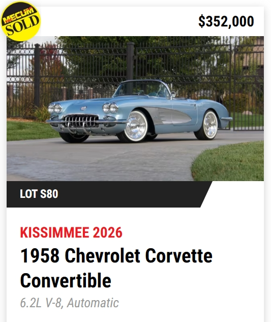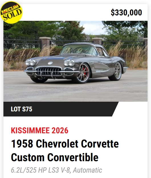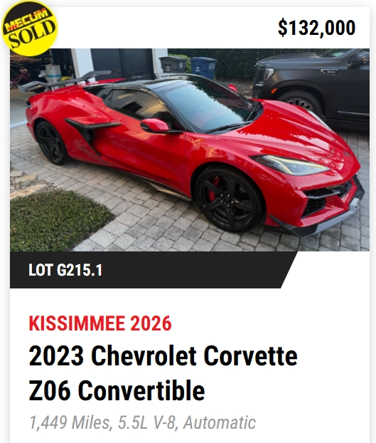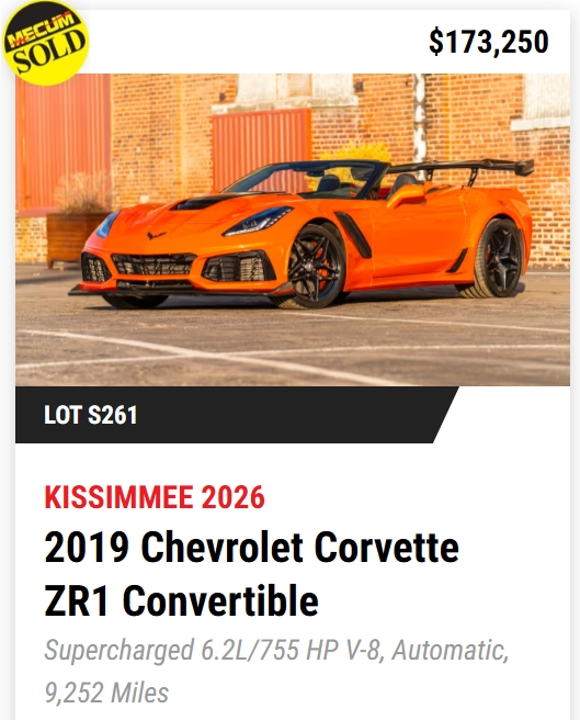 - TODAY, Mecum Kissimmee 2026: 401 Corvettes offered with 293 Vettes off to new owners! (73%)