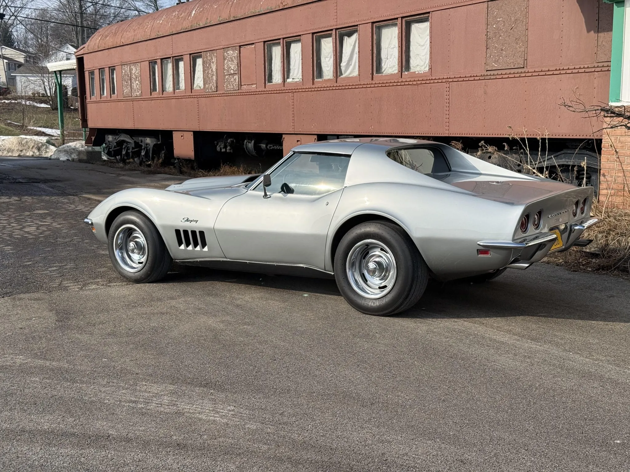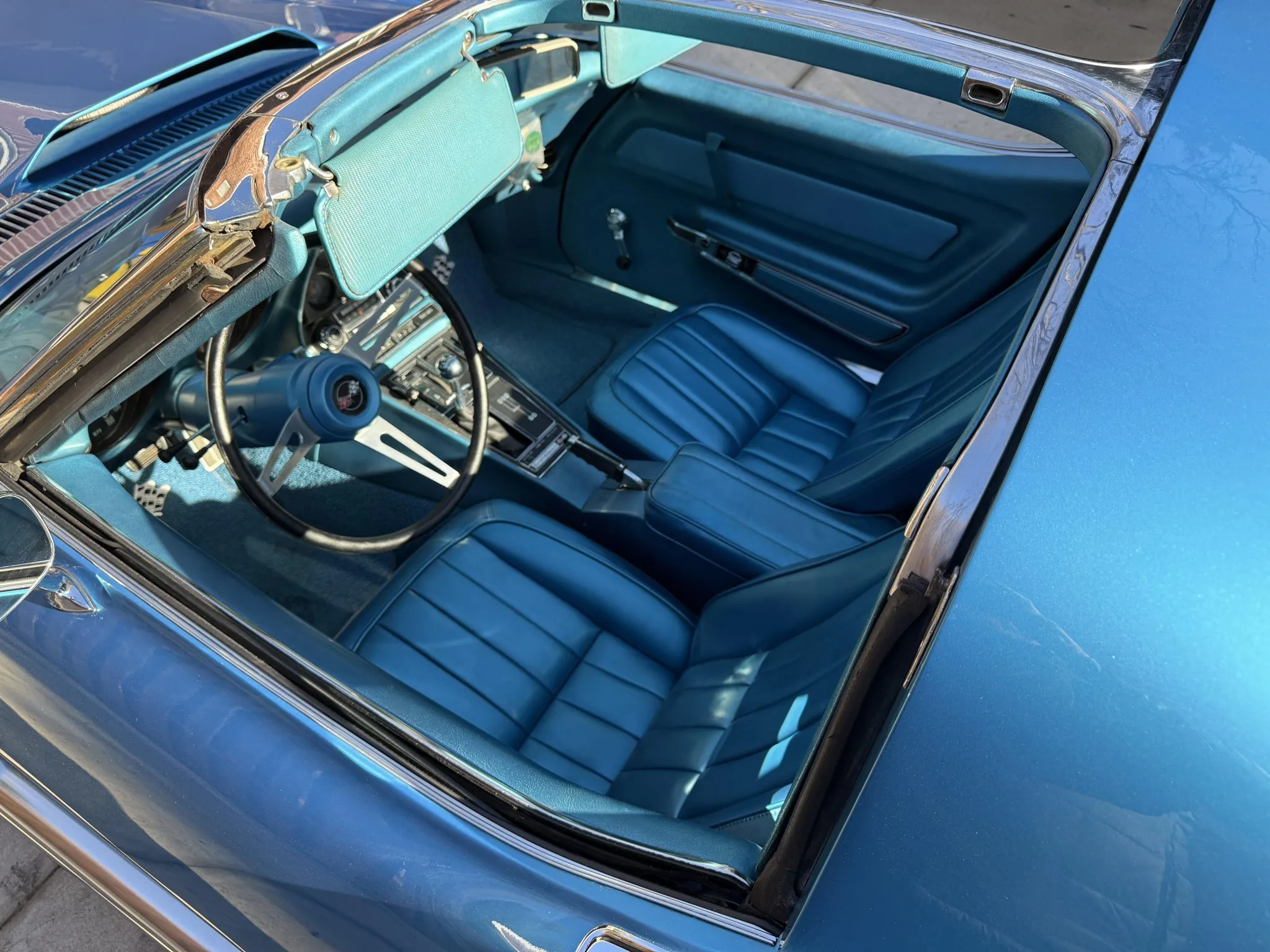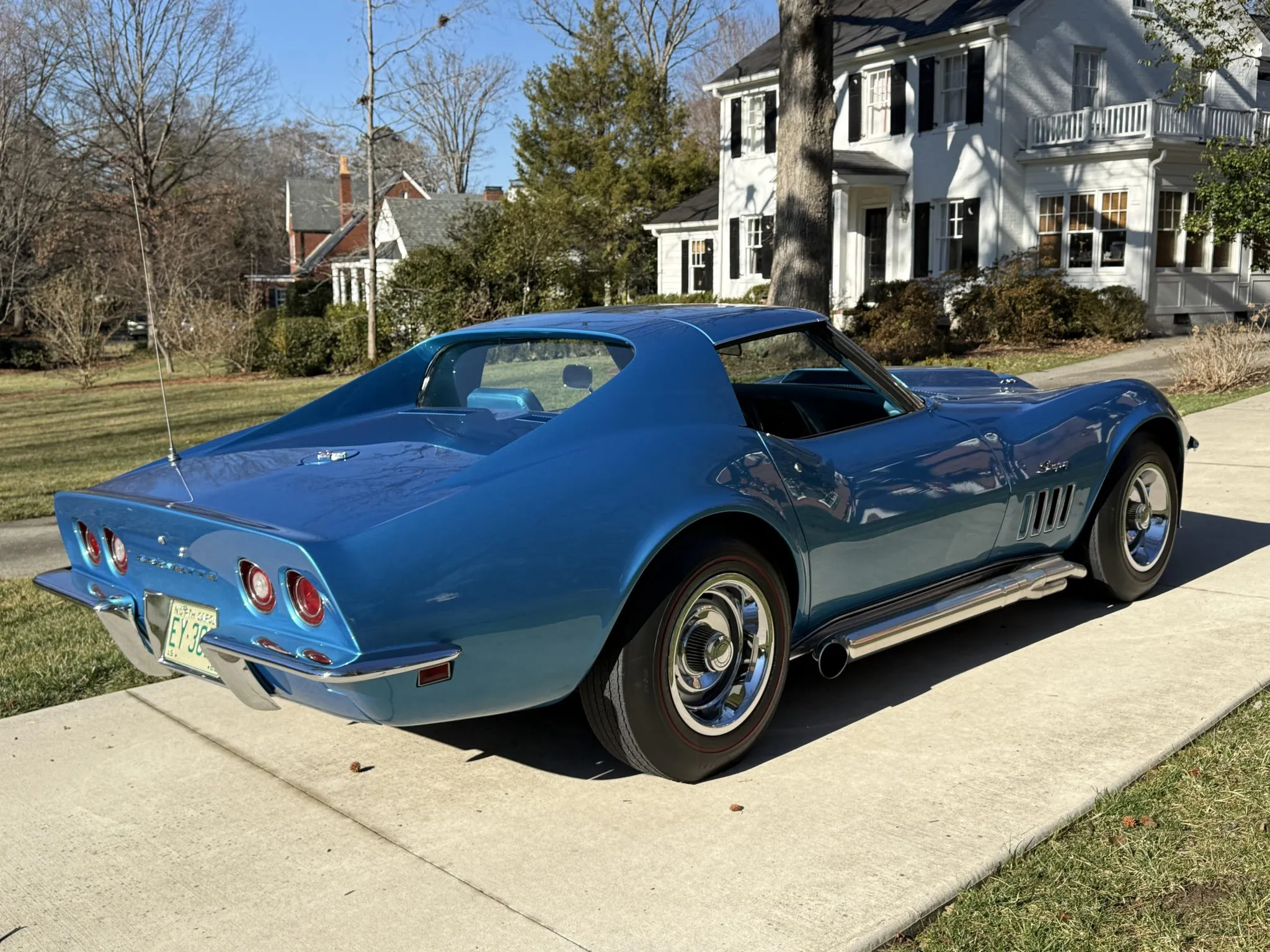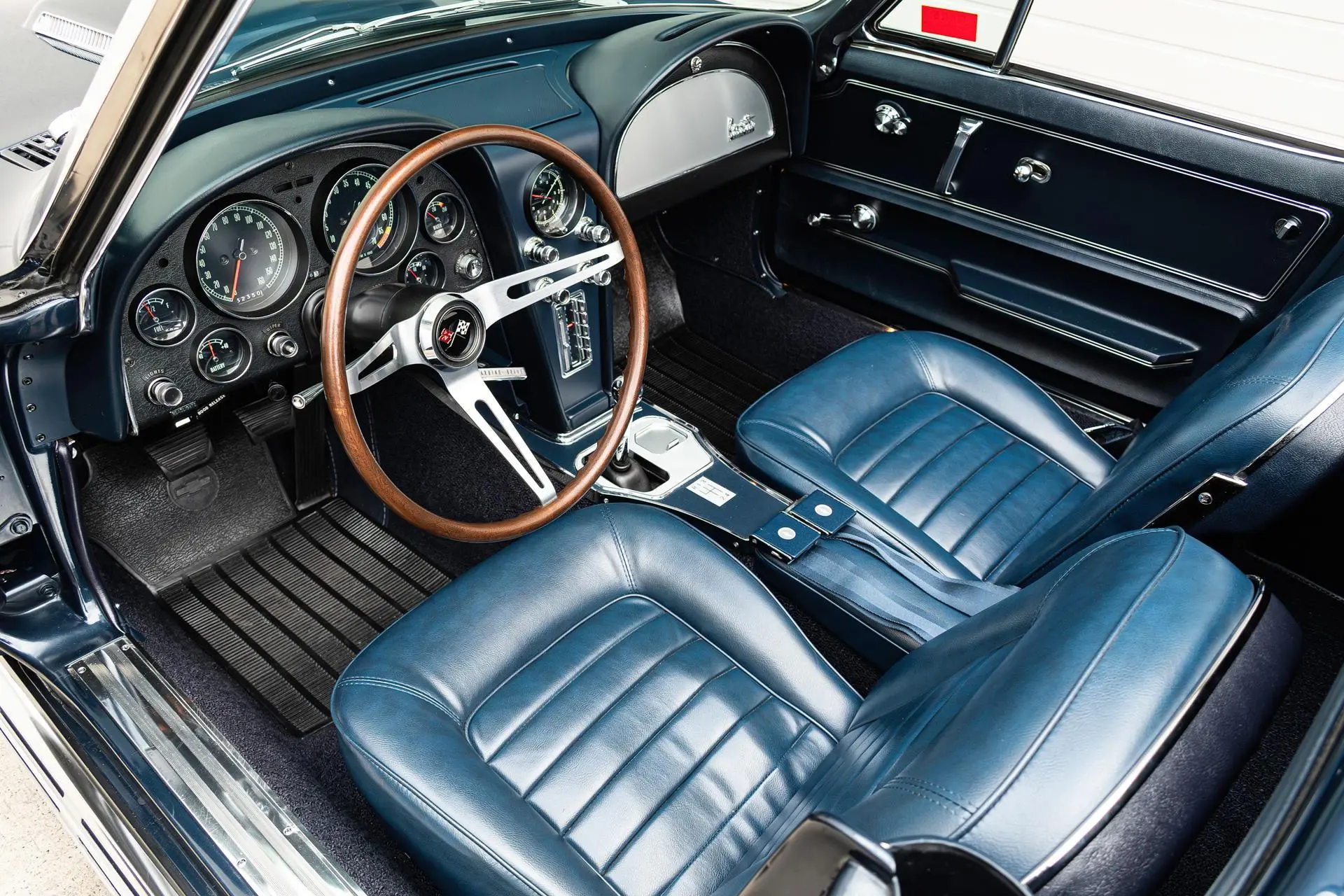 “This 1969 Chevrolet Corvette coupe is powered by a rebuilt 427ci L36 V8 that is said to have a solid lifter camshaft and a 12.5:1 compression ratio and tuned to run on 110 octane fuel. It is linked with a four-speed manual transmission and a Positraction limited-slip differential, and additional equipment includes a Holley carburetor, MSD ignition components, a Winters aluminum intake manifold and cylinder heads, and Doug’s headers and side pipes. It was refinished in LeMans Blue over a Bright Blue interior and had a front spoiler and L88-style hood added under previous ownership, and it is further equipped with removable roof panels, 15″ Rally wheels, four-wheel power-assisted disc brakes, an AM/FM radio, chrome bumpers, and hideaway headlights. The selling dealer acquired the car in 2024. This C3 coupe is now offered in North Carolina with the owner’s manual, recent parts invoices, and a clean Pennsylvania title.”