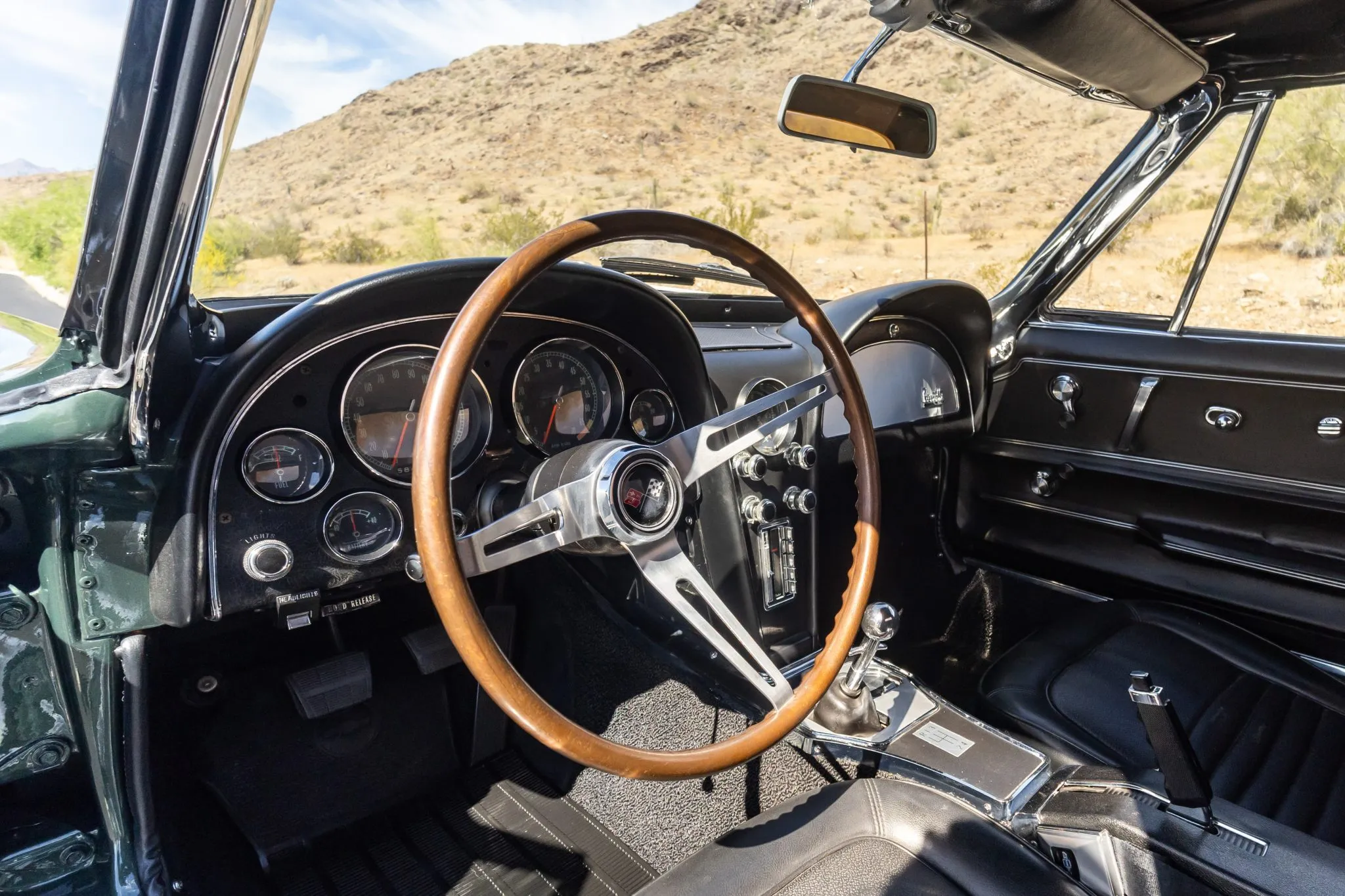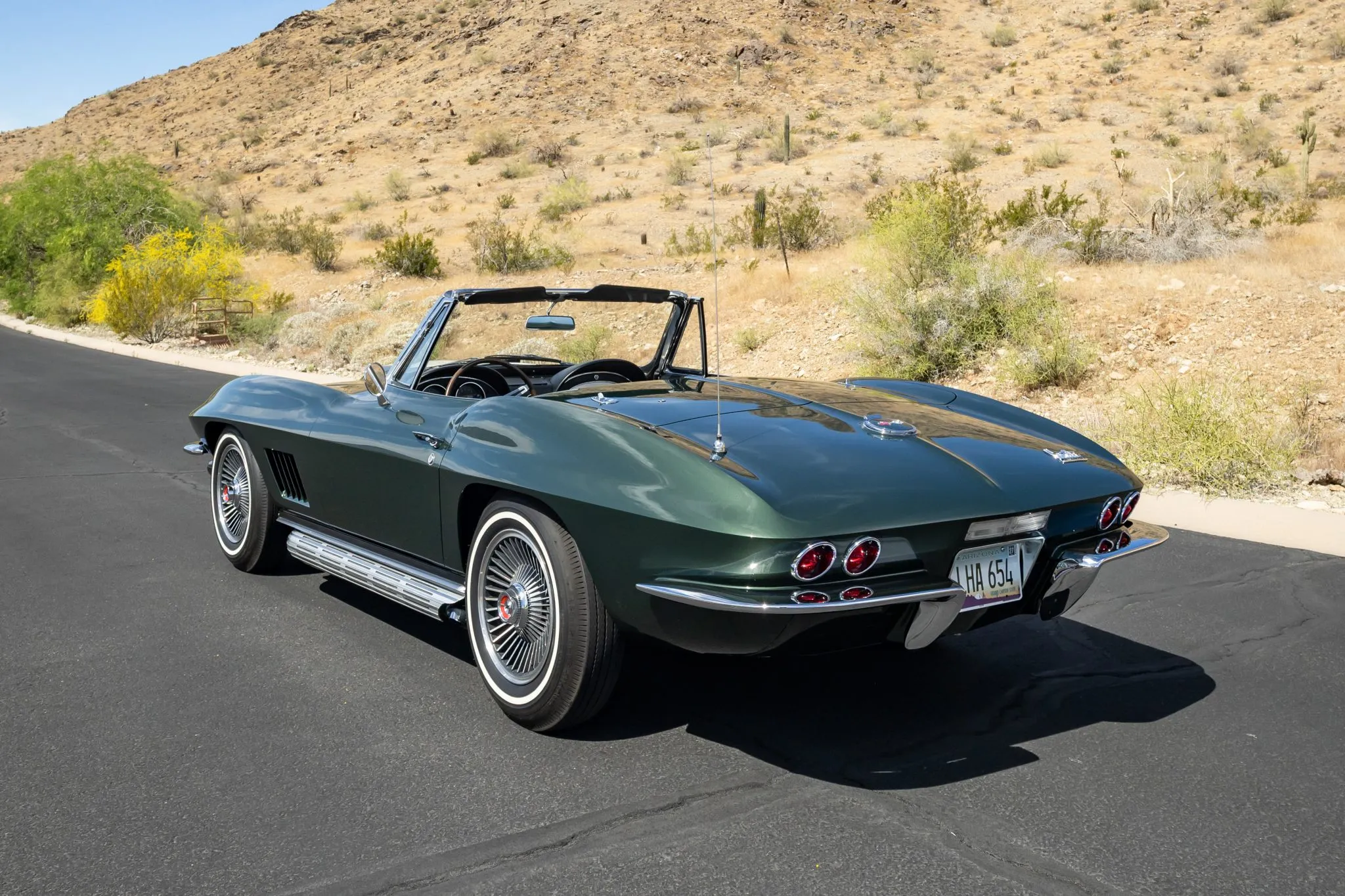 “This 1967 Chevrolet Corvette convertible was refinished in green over black around 2011 and is powered by a 427ci L71 V8 paired with a four-speed manual transmission. Equipment includes a white convertible soft top, 15″ turbine-style wheels, four-wheel disc brakes, side-exit exhaust pipes, a cabin heater, an AM/FM radio, chrome bumpers, and retractable headlights. This C2 was purchased by the seller in 2019 and is now offered with a photocopy of the tank sticker, the owner’s manual, service records, and a clean Arizona title in the seller’s name.”