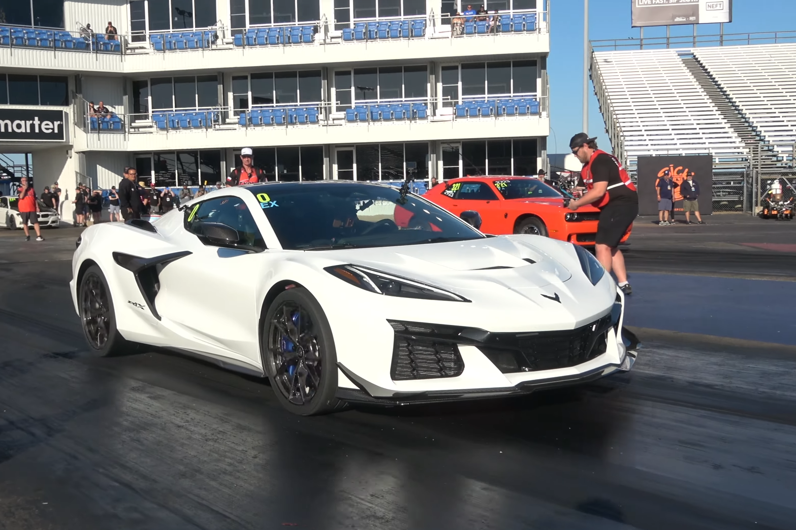 The drivers agree to use a full tree start to ensure a fair launch, as the Corvette’s dual-clutch setup requires more time to build boost. Once racing begins, the Demon launches aggressively—often lifting its front wheels—but the ZR1X’s superior power delivery allows it to surge ahead before the finish line.