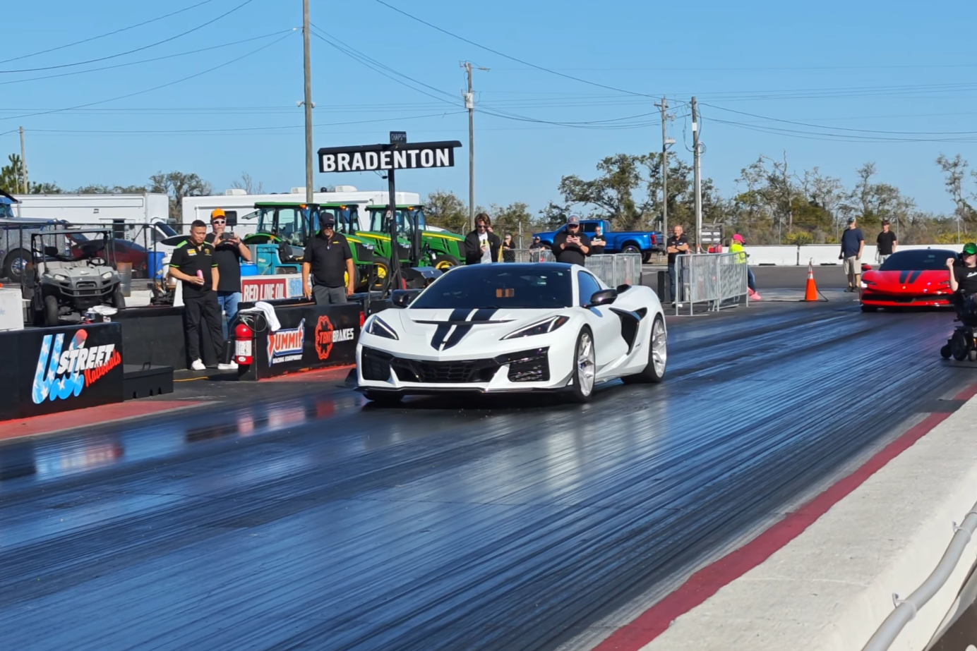 A rematch at Bradenton Motorsports Park pits Wheeler’s modified Chevrolet Corvette ZR1 against a tuned Lamborghini Revuelto in a series of quarter-mile runs filmed by DragTimes.